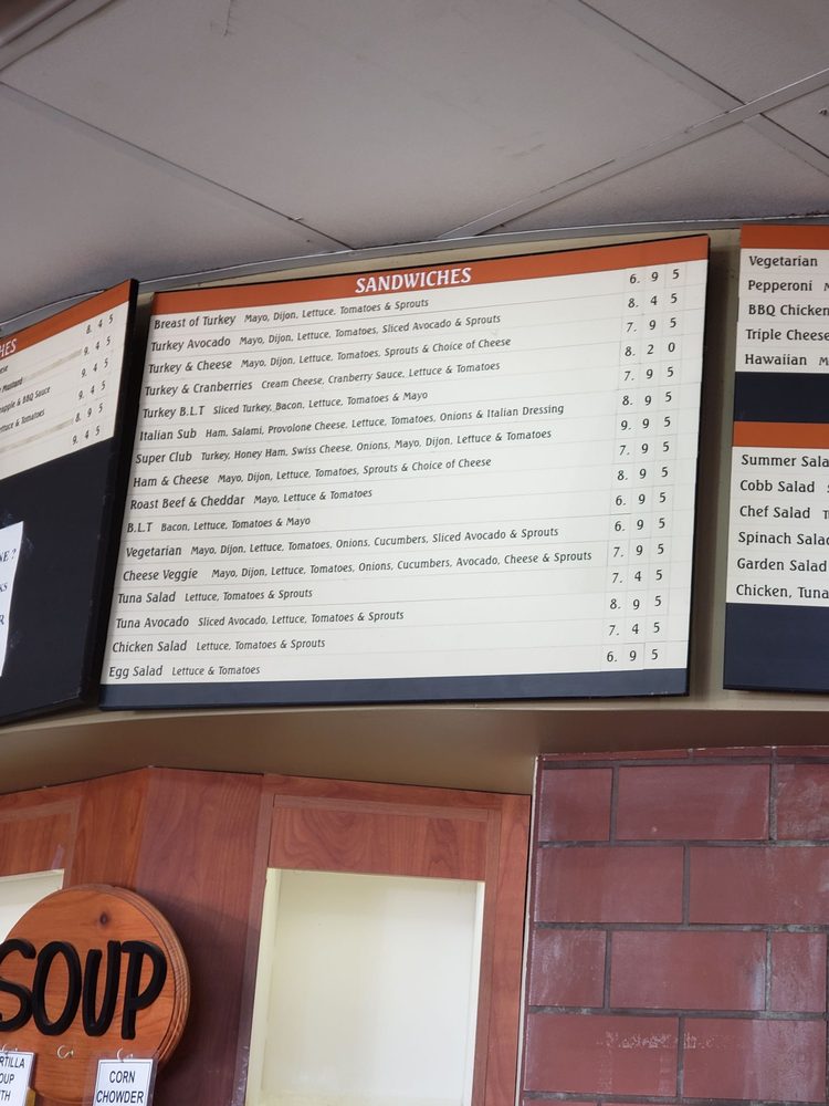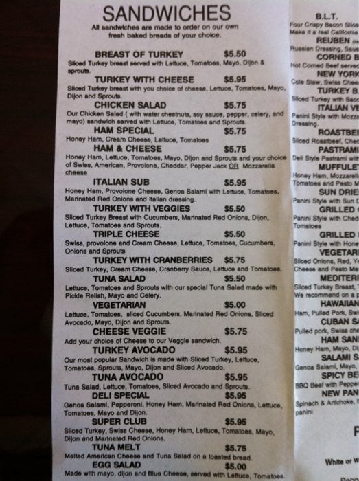 Sliced turkey breast, cranberry sauce, cream cheese, lettuce, and tomatoes. Recommended bread cranberry walnut.